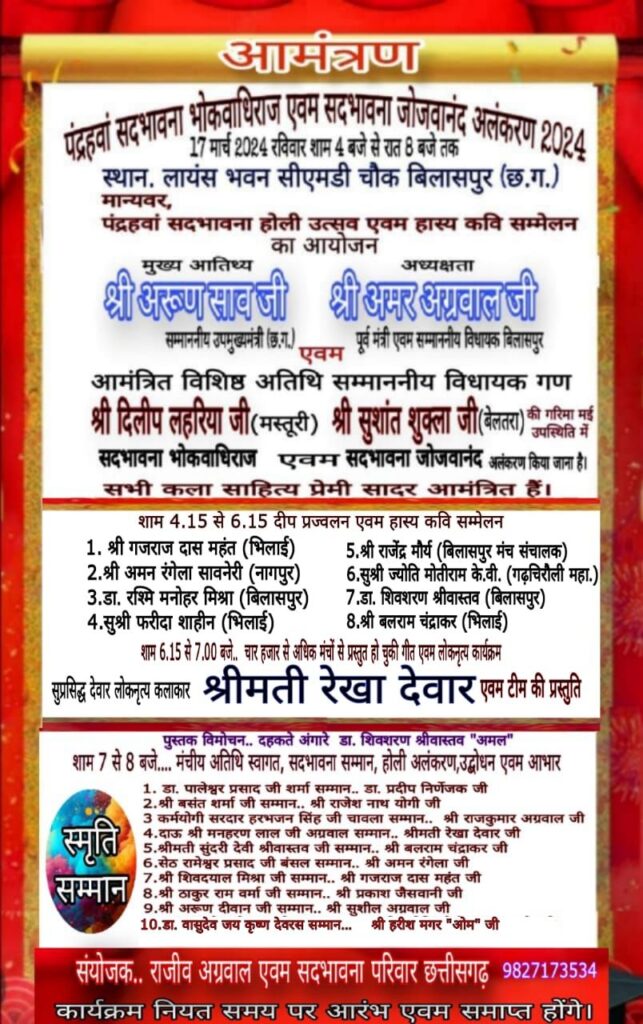 ऋषिकेश त्रिवेदी////. पंद्रहवां सदभावना होली उत्सव उप मुख्यमंत्री श्री अरूण साव एवम पूर्व मंत्री नगर विधायक श्री अमर अग्रवाल की अध्यक्षता में सत्रह मार्च रविवार को लायंस भवन में शाम चार बजे से रात आठ बजे तक आयोजित किया जा रहा है। कार्यक्रम में मस्तूरी विधायक श्री दिलीप लहरिया एवम बेलतरा विधायक श्री सुशांत शुक्ला विशिष्ठ अतिथि होंगे। बहुप्रतीक्षित सदभावना भोकवा धीराज एवम सदभावना जोजवानंद अलंकरण कार्यक्रम के साथ चार हजार से अधिक में प्रदर्शन एवम दाऊ मंदरा जी पुरुस्कार प्राप्त सुप्रसिद्ध देवार नृत्य गीत लोक कलाकार श्रीमती रेखा देवार एवम उनकी टीम अपनी प्रस्तुति देंगी। आयोजन के कवि सम्मेलन में श्री गजराज दास महंत, श्री अमन रंगेला नागपुर, सुश्री ज्योति मोतीराम के वी गढ़चिरौली, सुश्री फरीदा साहिन, श्री बलराम चंद्राकर, डा. रश्मि मिश्रा, डा. शिवशरण श्रीवास्तव एवम श्री राजेंद्र मौर्य शामिल होंगे। सदभावना द्वारा परंपरा नुसार कला, साहित्य, शिक्षा, समाजसेवा, आदि क्षेत्र के चयनित विभूतियों को डा. पालेश्वर प्रसाद शर्मा, श्री बसंत शर्मा, कर्मयोगी श्री हरभजन सिंह चावला, दाऊ श्री मनहरण लाल जी अग्रवाल, श्रीमती सुंदरी देवी श्रीवास्तव, स्वतंत्रता संग्राम सेनानी डा. वासुदेव जय कृष्ण देवरस, श्री ठाकुर राम वर्मा, सेठ रामेश्वर प्रसाद बंसल एवम श्री शिवदयाल मिश्रा जी की स्मृति में सदभावना सेवा सम्मान प्रदान किया जाएगा। परंपरागत भोकवाधिराज एवम जोजवानंद होली अलंकरण मे प्रति वर्ष प्रमुख व्यक्तित्व का सार्वजनिक रूप से हास्य व्यंग की विधा में सामाजिक अंकेक्षण किया जाता है। कार्यक्रम को सफल बनाने संयोजक राजीव अग्रवाल, विजय वर्मा, मुरारी अग्रवाल, बालगोविंद, प्रद्युम्न अग्रवाल, शिवशंकर, महेंद्र, राजेश, शैलेंद्र गुप्ता, नवनीत जायसवाल, चंद्रभूषण ध्रुवंशी, ऋषिराज सिंह, मनीष दीवान, राजेश ठाकुर, आशीष गोल्डी अग्रवाल, चंद्रप्रदीप बाजपेई सहित टीम के लोग प्रयासरत हैं।