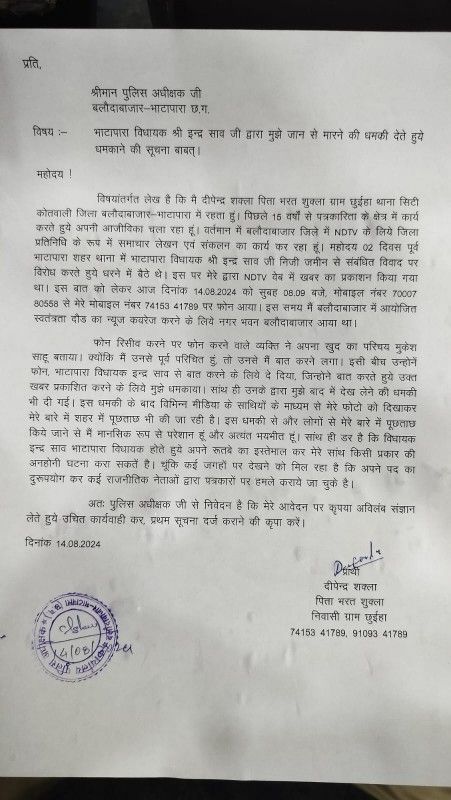ऋषिकेश त्रिवेदी////पत्रकार को जान से मारने की धमकी देने वाले कांग्रेसी विधायक की चारो ओर आलोचना हो रही है,एनडीटीवी वेब के पत्रकार दीपेंद्र शुक्ला वर्षों से पत्रकारिता कर रहे हैं, बलौदा बाजार में स्वतंत्रता दौड़ की खबर बनाने के साथ ही अन्य खबरों को भी उन्होंने प्रसारित किया।जिसमे शहर की हालातों के बारे में भी बताया गया,बलौदा बाजार और आसपास के क्षेत्र की बदहाली की खबरें प्रसारित करते रहे हैं।दो तीन दिन पहले बलौदा बाजार विधायक इंद्र साव जी निजी जमीन के मामले को लेकर धरने में बैठे थे,जिसकी खबर दीपांशु शुक्ला ने प्रसारित की थी,जो विधायक महोदय को ठीक नहीं लगी ,जिसे लेकर अपने साथी मुकेश के फोन से दीपांशु को कॉल कर ऐसी खबरें लगाने से मना किया साथ ही ऐसा नहीं करने पर देख लेने की बात तक कह डाली।जिसकी लिखित शिकायत प्रकार दीपांशु ने एस पी और संबंधित थाने में की है।इतना ही नहीं सोशल मीडिया के माध्यम से मुख्यमंत्री और कांग्रेस के आला पदाधिकारियों तक शिकायत हो गई है। वहीं कु